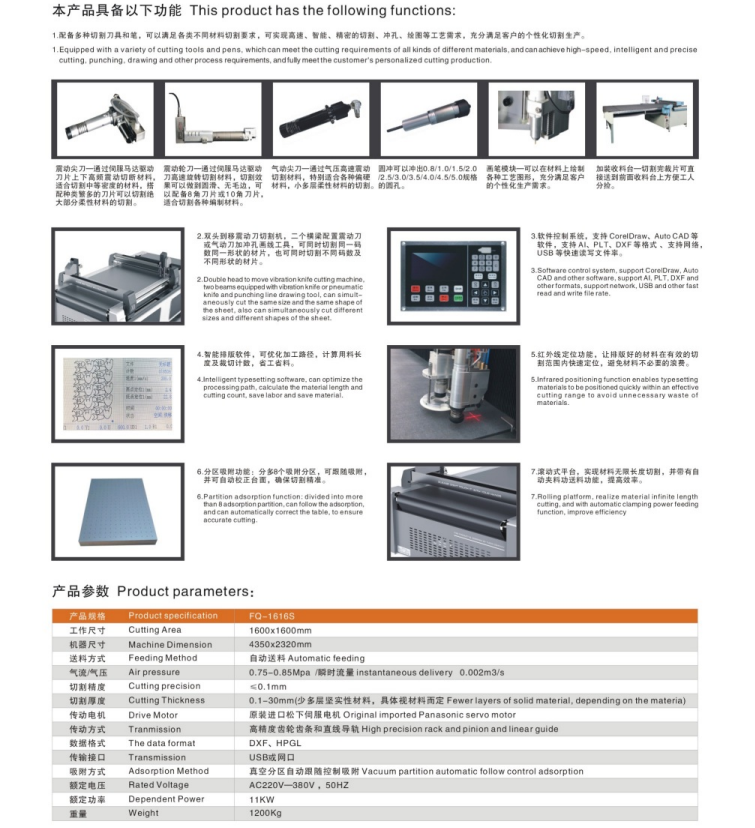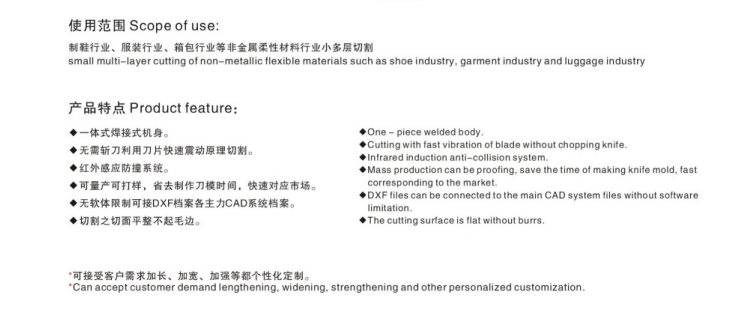 The intelligent vibration knife cuting machine has dual beam mutual movement, fully automatic transmissioninteligent paginaion, and continuous operation, Diferent cuting tools can be selected to achieve single-layer and muli-layer cutingFor cutting materials such as genuine leather, Pu,leather, fabric, fibers, composite materials, mesh, etc., different cutting tools areselected for diferent materials, this machine is most suitable for cutting shoe upper processing orders.